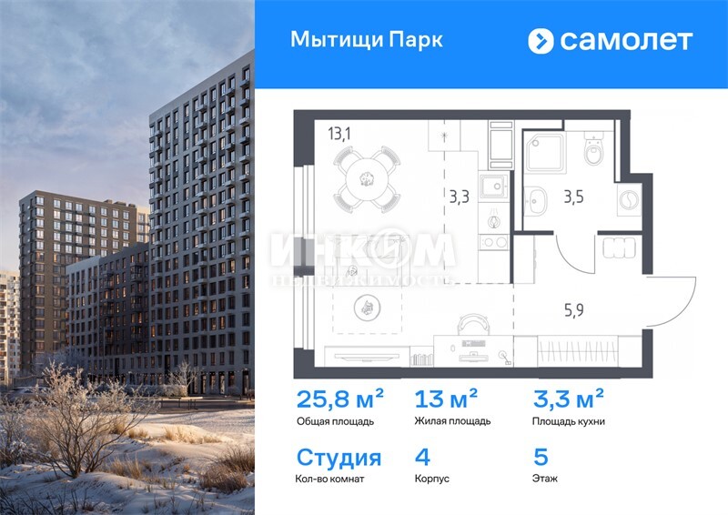 1-комнатная квартира, 5 этаж, 25.8 м2