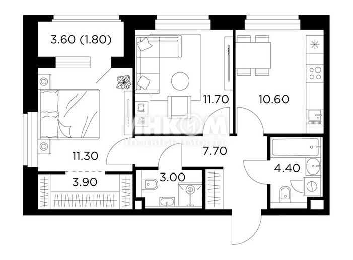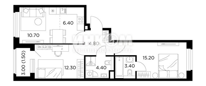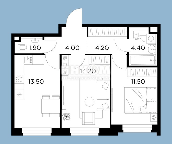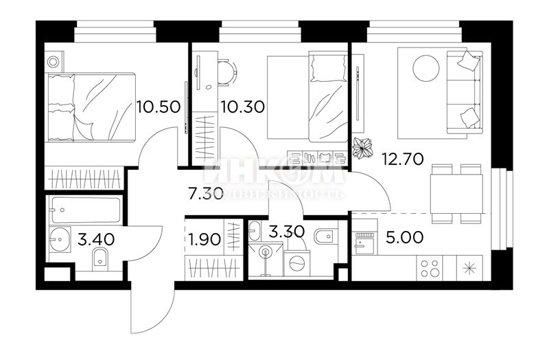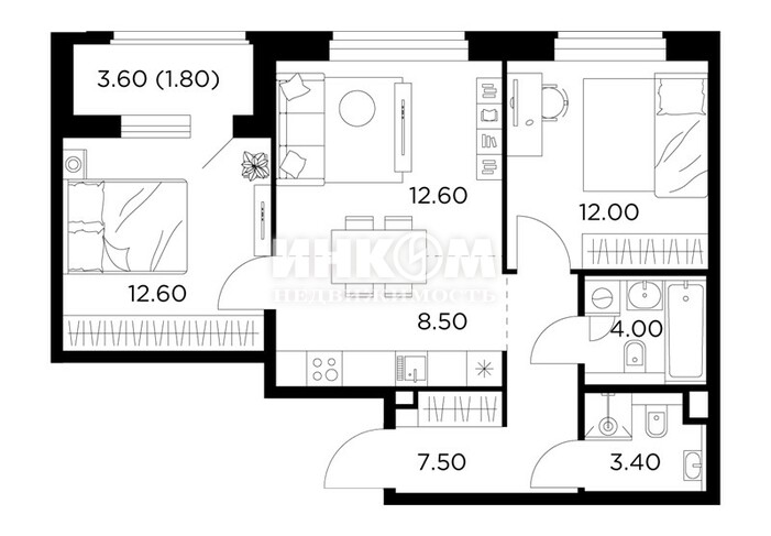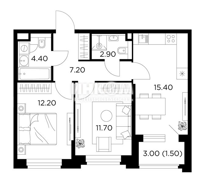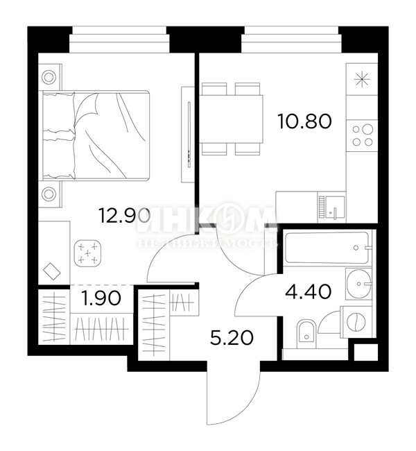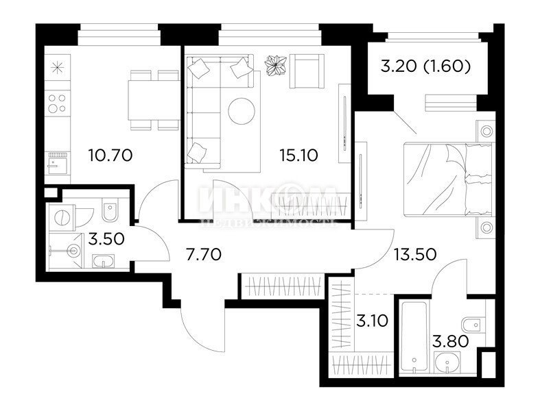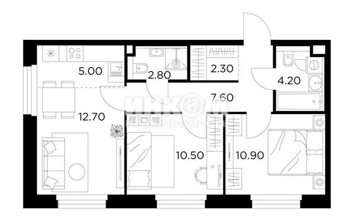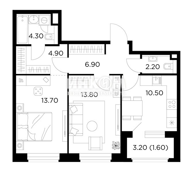 2-комнатная квартира, 2 этаж, 51.6 м2