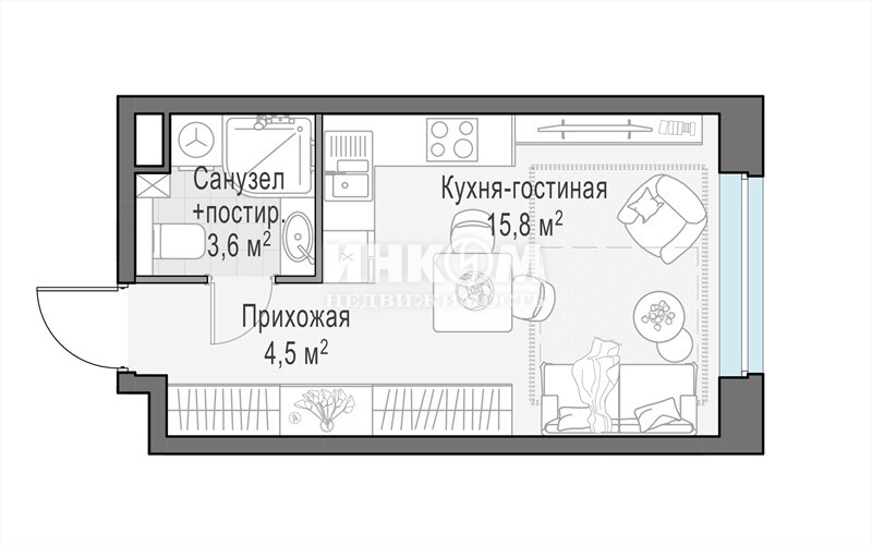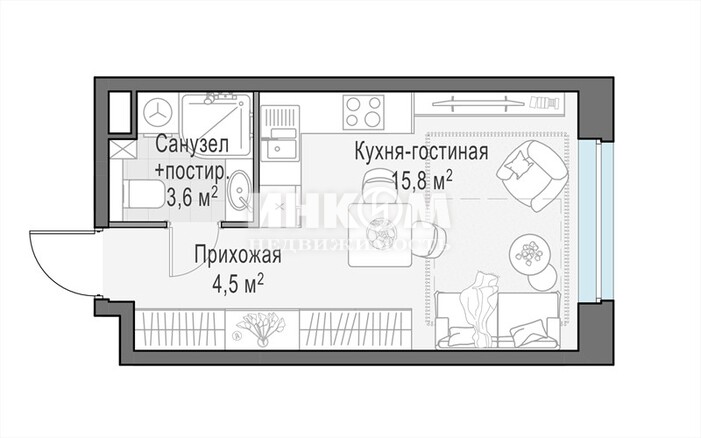 1-комнатная квартира, 9 этаж, 23.8 м2