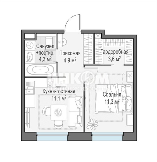 1-комнатная квартира, 11 этаж, 35.2 м2