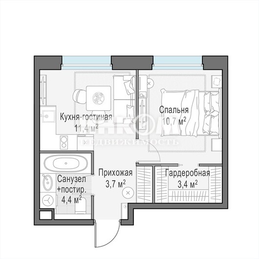 1-комнатная квартира, 12 этаж, 33.3 м2
