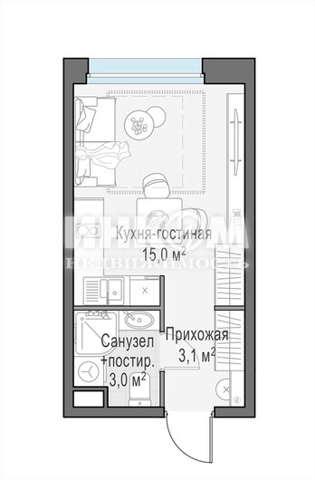 1-комнатная квартира, 13 этаж, 21.1 м2