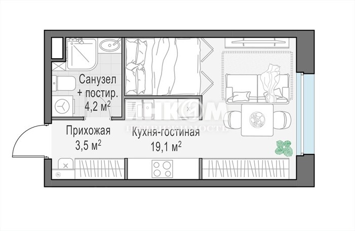 1-комнатная квартира, 2 этаж, 26.9 м2