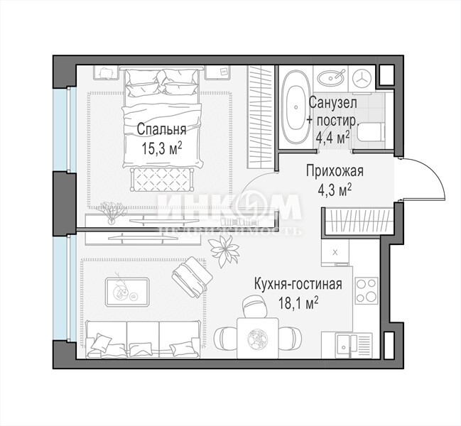 2-комнатная квартира, 23 этаж, 42 м2
