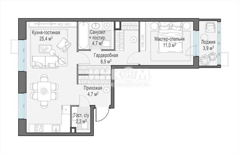 2-комнатная квартира, 7 этаж, 55.8 м2