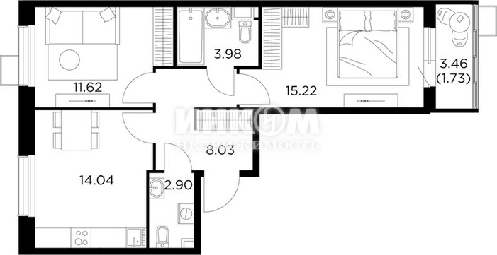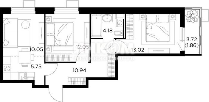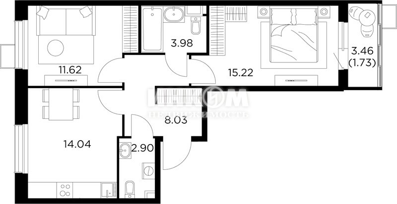 2-комнатная квартира, 8 этаж, 48.5 м2