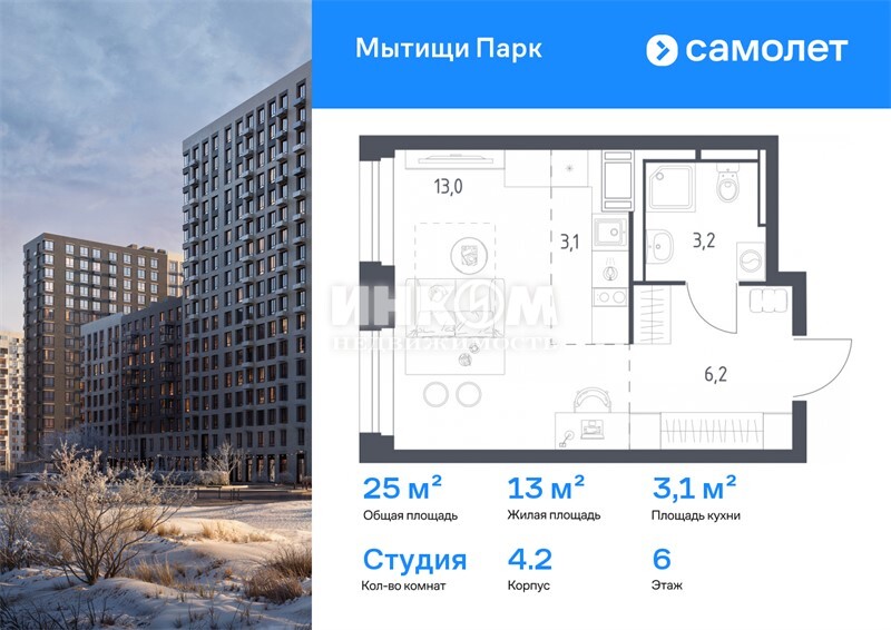 1-комнатная квартира, 6 этаж, 25 м2