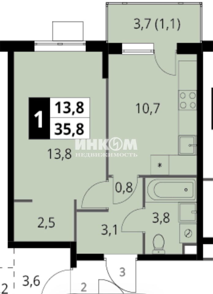 1-комнатная квартира, 10 этаж, 35.8 м2