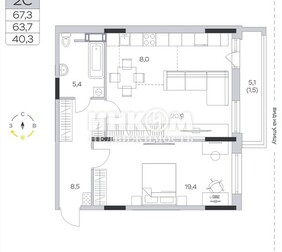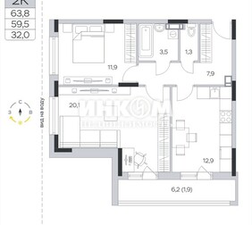 2-комнатная квартира, 63.6 м², этаж 8/9