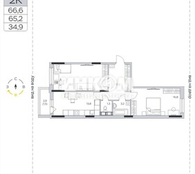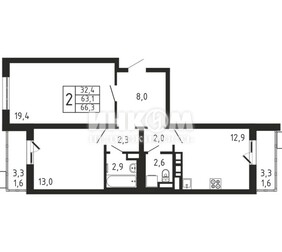 2-комнатная квартира, 66.3 м², этаж 9/9