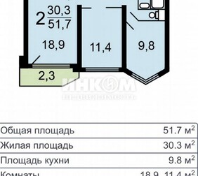 2-комнатная квартира, 51.4 м², этаж 9/14